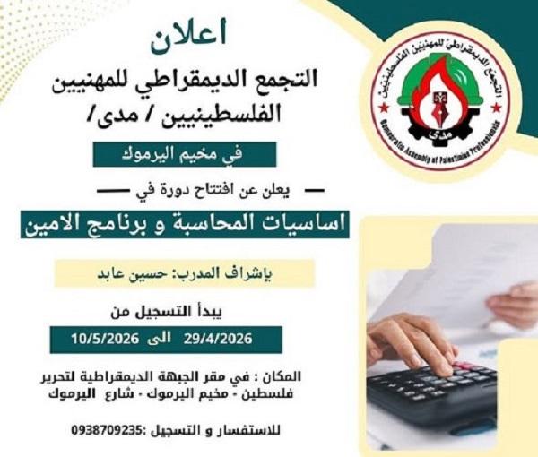 اعلان التجمع الديمقراطي للمهنيين الفلسطينيين /مدى/ في مخيم اليرموك عن افتتاح دورة في اساسيات المحاسبة وبرنامج الامين