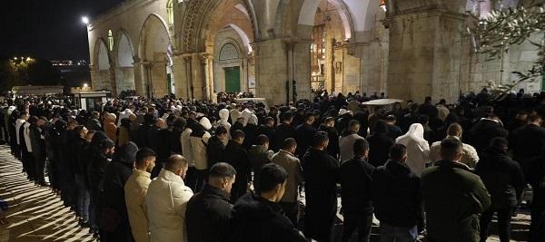 وقالت محافظة القدس، في بيان مقتضب، إن 60 ألف مصلٍ أدوا صلاتي العشاء والتراويح في رحاب المسجد الأقصى، رغم القيود والإجراءات المشددة التي فرضتها قوات الاحتلال الإسرائيلي على دخول المصلين.